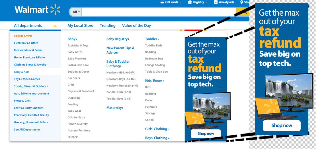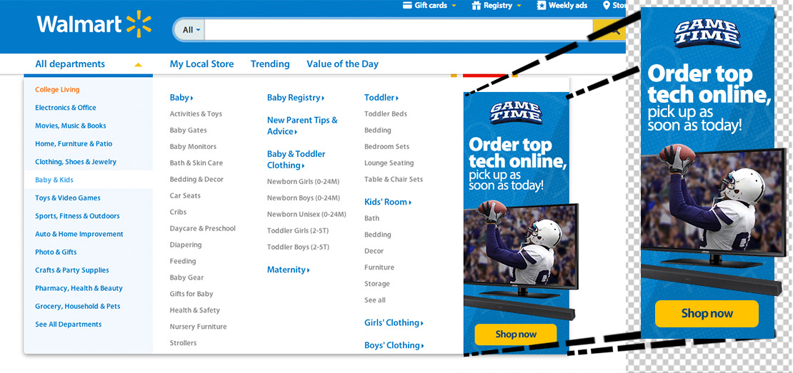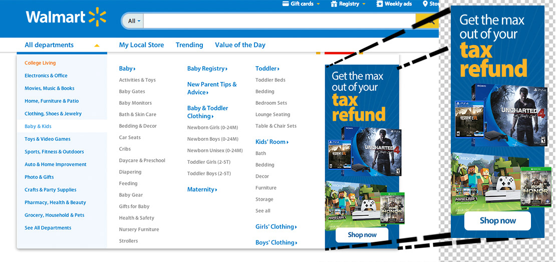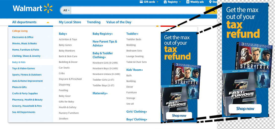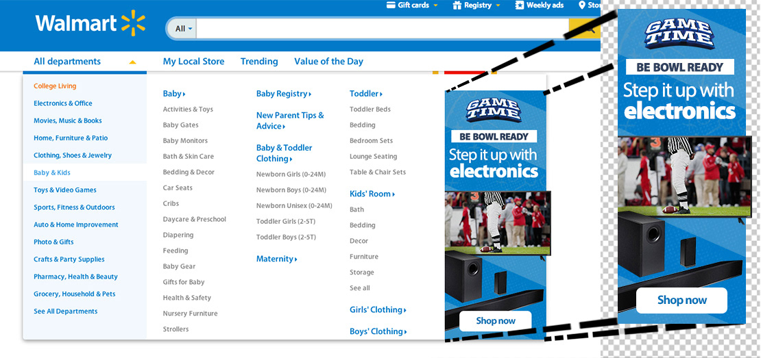I developed and edited banners, ads, and product visuals for the Walmart website.
